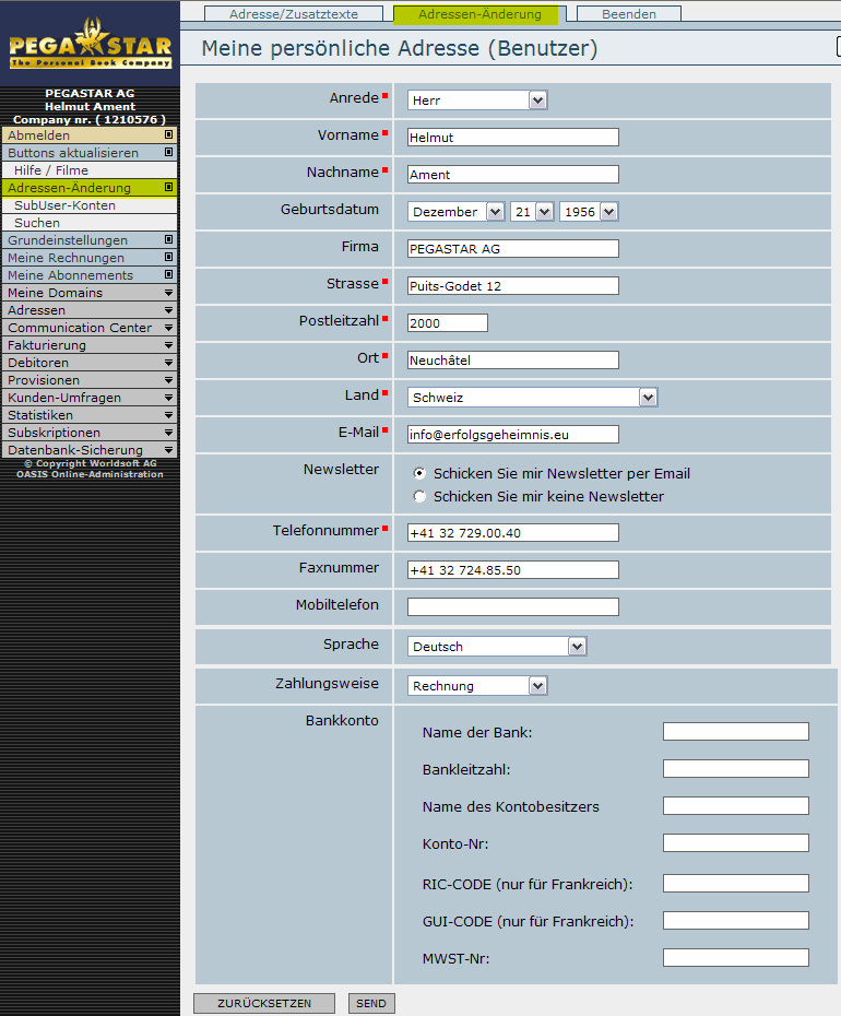 1. myAdmin / OASIS / ECMS: www.worldsoft-oasis.info (Button Adressen-Änderung)