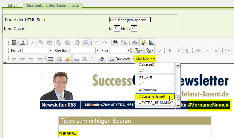 Im WYSIWYG-Editor finden Sie jetzt auch die Ihnen bekannten Makros von den Rund-E-Mails aus dem Communication-Center. Diese können Sie jetzt auch in HTML-Seiten einbauen (Funktion nur möglich für Kunden, die unsere Adress-Datenbank und das Internet-Communication-Center im Paket haben):