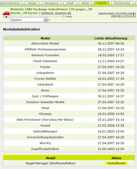 Manche Kunden benötigen nicht alle im Paket mitgelieferten Module. Um die Datenbanken zu schonen, werden die Module jetzt nicht mehr automatisch sofort komplett installiert. Wenn Sie ein Modul benötigen, dann bitte unter "Module" kurz auf den Link "Installieren" klicken - und das Modul wird aktiv. Screenshot: