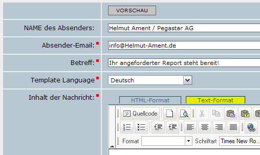 Nachdem Sie die HTML-Version erstellt haben, klicken Sie auf den Button "Text-Format" und IMPORTIEREN die Texte von der HTML-Version. Danach können Sie den Text optimal für die Text-Version optimieren.