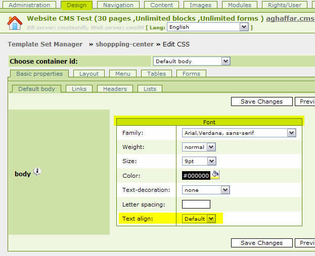 | Im Bereich Design, CSS-Editor haben wir im Font-Bereich den Stil "Text align" ergänzt. Damit können Sie jetzt die Textausrichtung in den einzelnen Bereichen leichter festlegen (z.B. Topzeile einer Tabelle). Wenn Sie für einen besonderen Zweck, z.B. die Adressliste, eine spezielle Tabellenform benötigen, erstellen Sie für diesen einen Button einfach eine KOPIE des normalen Skins - ordnen nur diesem Button diesen Sonderskin zu - und können so nur für diesen einen Button ein komplett anderes CSS aufbauen.